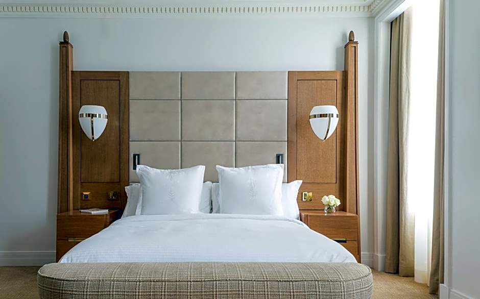 The Four Seasons Heritage Suite features a king-sized bed, historic columns, ornate plaster work and a working fireplace. The luxury bathrooms feature a separate shower and a large bath framed by mosaic tilework. There is also a mini refrigerator, mini-bar and a Nespresso machine. A 55-inch flat-screen TV and iPad are available for guests.